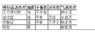 我们不是来普及心理学知识的,常识还是要说一点的。巴甫洛夫认为人的气质是由人的高级神经活动类型决定的。大脑皮层的基本神经过程有强度、均衡性和灵活性三种基本特性。根据这三种特性可以将个体的神经活动分为不同的神经活动类型。神经过程的强度是指神经系统兴奋与抑制的能力,兴奋与抑制能力强,其神经活动就是强型,兴奋与抑制能力弱,其神经活动就是弱型。均衡性是指兴奋与抑制能力的相对强弱。根据神经活动的均衡性,可以将强型又分为两类:如果兴奋与抑制的能力基本接近,就是平衡型;兴奋能力明显高于抑制能力,就是不平衡型。灵活性是指兴奋与抑制之间相互转换的速度。