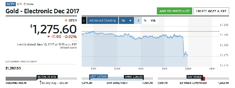 现货黄金短线跳水10美元,刷新11月7日以来盘中低点至1274.35美元/盎司,使得日内跌幅超过0.7%。黄金期货也大幅下挫,数据显示有价值超过40亿美元名义价值的期货黄金瞬间遭到抛售。