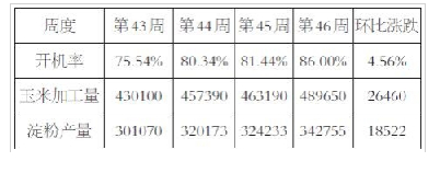 表为38家淀粉企业近四周玉米淀粉产量及开工率对比