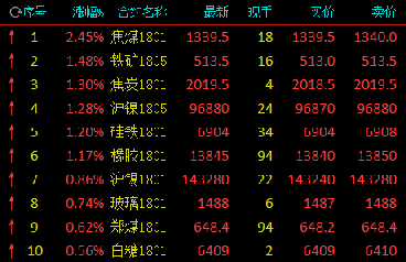 截止午后收盘,焦煤涨2.45%,铁矿涨1.48%,焦炭涨1.30%,沪镍涨1.28%;跌幅方面,热卷跌0.75%,沪铅跌0.67%,淀粉跌0.58%。
