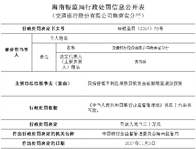 集金期货通2017年11月29日消息:据悉,交通银行股份有限公司海南省分行因贷后管理不到位导致贷款资金被挪用至期货投资,海南银监局依据《中华人民共和国银行业监督管理法》第四十六条第五款,对其罚款人民币二十万元。