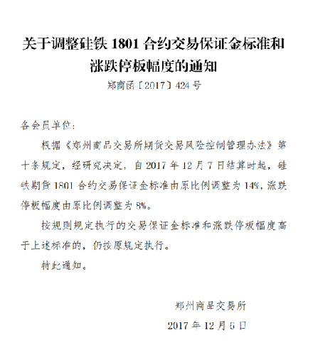 在这三日连续暴涨20%后,郑商所于6日下午发布公告称,自2017年12月7日结算时起,硅铁期货1801合约交易保证金标准由原比例调整为14%,涨跌停板幅度由原比例调整为8%。