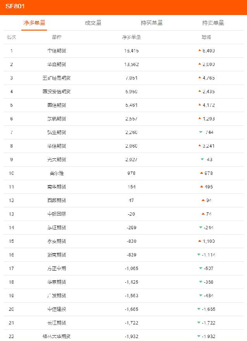 反观空头方面,徽商期货今日小量增加净空单166手,以2714手净空单排名空头第一。海通期货今日增加净空单1355手,以2261手净空单排名第二。空头整体持净空单量也有所增加,昨日超过2000手净空单持有量的仅有2家,而今日达到6家。排名前六的全部净多单也堪堪对抗中信这一超级大多头。