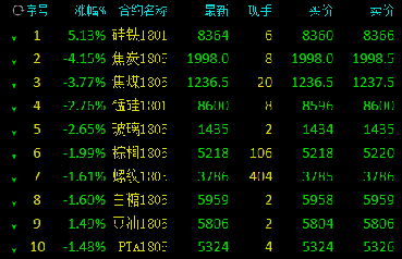 集金期货通2017年12月15日消息:商品期货铁合金大跌,硅铁跌逾5%,锰硅跌近3%;黑色系焦炭跌逾4%,焦煤跌近4%,螺纹跌逾1%;有色金属午后回落,镍、锌、铅、锡飘红;能化板块普跌,仅橡胶涨逾1%,玻璃跌逾2%,郑醇、PTA跌逾1%;农产品涨跌不一,淀粉、鸡蛋涨逾1%,棕榈、白糖、豆油跌逾1%。