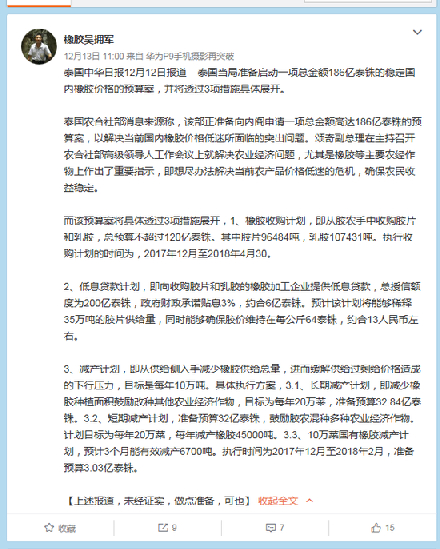 市场传泰国橡胶减产,1805合约今日早盘开盘上行,涨逾2%。微博大V@橡胶吴拥军发文称,泰国当局准备启动一项总金额186亿泰铢的稳定国内橡胶价格的预算案,实行减产计划,即从供给侧入手减少橡胶供给总量,进而缓解供给过剩给价格造成的下行压力。