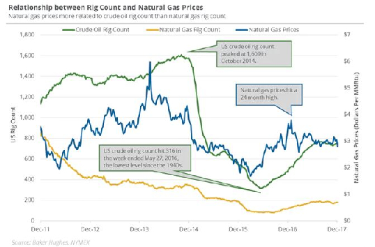 美国天然气期货在2016年底曾触及3.724美元/百万英热单位,但由于北美连续两年经历暖冬,夏天气温也不够炎热,减少了家庭供暖与空调制冷需求。美国油产也自2016年中旬涨超16%,作为石油产量附属品的天然气也自2016年起陷入超供格局。