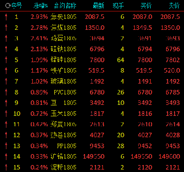 除动力煤(661, -7.00, -1.05%)飘绿外,黑色系主力走强,焦炭(2088, 59.50, 2.93%)、焦煤(1350, 36.50, 2.78%)、锰硅(7800, 152.00, 1.99%)等涨逾1%;有色金属齐齐跳水,沪镍(101660, -2590.00, -2.48%)领跌2.48%;化工品玻璃(1492, 15.00, 1.02%)、PVC(6780, 60.00, 0.89%)翻红,沥青(2848, -52.00, -1.79%)回落跌近2%;农产品行情分化,大豆(3492, 28.00, 0.81%)、玉米(1817, 13.00, 0.72%)飘红,豆油、菜籽飘绿。