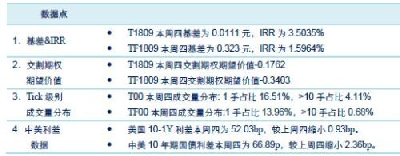 本周四,T1809基差为0.0111元,IRR为3.5035%;TF1809基差为0.323元,IRR为1.5964%。