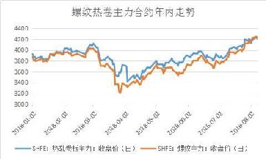 期货方面,螺纹主力合约目前有上破去年高点的态势,反观热卷主力合约,虽然近期维持涨势,但幅度要明显低于螺纹,同时,离去年高点4400仍有一段距离。