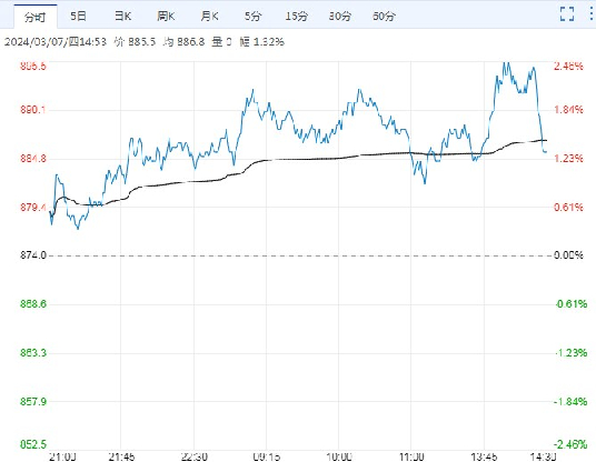 3月7日午盘,铁矿石主力合约震荡走高,目前盘内报884.5元,涨幅1.20%。整体来看,铁矿基本面相对宽松,不过考虑到铁水未来存在回升预期,所以盘面短期继续下行的空间有限,预计走势震荡为主。