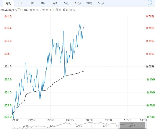 4月17日早盘,铁矿石主力合约小幅上涨,目前盘内报839.5元,涨幅0.60%。钢联数据显示,铁水产量环比再次小幅回升,但回升幅度较小,现实供需仍弱。宏观驱动向上,铁矿石短线震荡,整体仍延续上涨。操作建议:短线偏多参与。