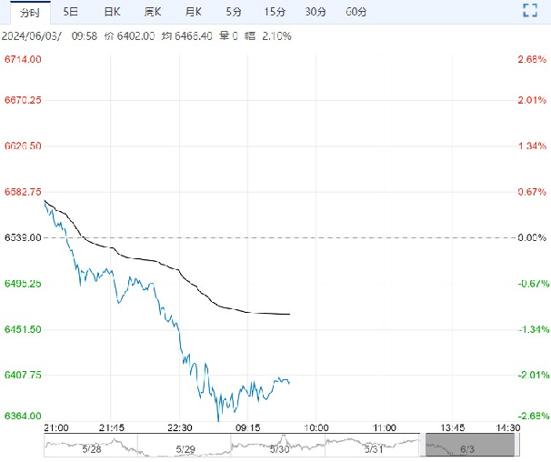 6月3日早盘,PVC主力合约大幅下行,目前盘内报6402元,跌幅-2.10%。目前PVC依旧是弱现实与政策预期之间的博弈,宏观预期虽偏强但基本面并无太大支撑,需求现实端依旧偏弱,社会库存延续高位。PVC在基本面支撑不足下或难以形成趋势性行情,短期需要警惕宏观商品情绪阶段性走弱后,市场再度交易弱现实的可能。