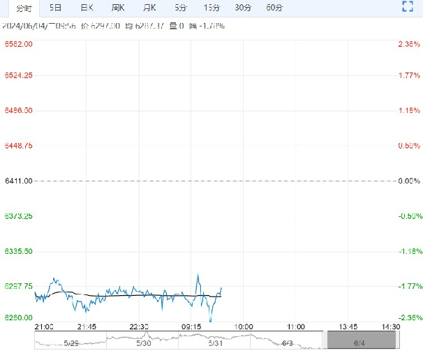 6月4日早盘,PVC主力合约弱势震荡为主,目前盘内报6297元,跌幅-1.78%。目前PVC依旧是弱现实与政策预期之间的博弈,宏观预期虽存但基本面并无太大支撑,需求现实端依旧偏弱,社会库存延续高位。短期宏观商品情绪阶段性走弱,PVC市场再度交易弱现实,部分资金离场,盘面回调,继续关注后期政策端情况。