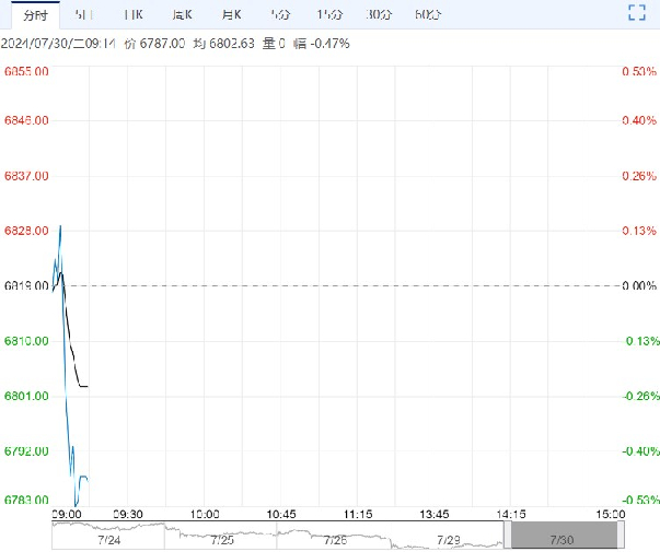 7月30日早盘,苹果主力合约弱势下行,目前盘内报6787元,跌幅-0.47%。随着早熟果品种及供应量增多,结合市场客商心理及终端实际消费,预计早熟品种主流价格走弱可能性较大,同时早熟品种作为补充,冷库果好货供应偏紧局面有所缓解,造成果农差货去库进一步承压,关注清库节奏及价格回落幅度,目前建议投资者偏空对待,关注反弹做空机会,谨慎操作控制风险。