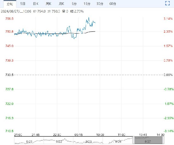 8月27日早盘,铁矿石主力合约大幅上行,目前盘内报754元,涨幅2.79%。成材淡旺季转换阶段,市场仍有一定旺季预期,宏观层面临近美联储9月降息窗口,加之近期国内有政策加预期,黑色系盘面尝试反弹,上方空间关注后续成材需求的配合力度。