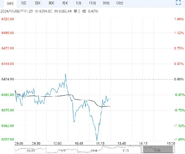 11月6日早盘,锰硅主力合约弱势下行,目前盘内报6394元,跌幅-0.47%。近期市场需求持续小幅回暖,市场预期有所好转,当前铁合金供需情况由过剩逐步趋于平衡;铁合金期货回落后试探前期市场底部获得支撑,成本支撑作用逐步显现,预计下行空间较小,建议关注回调做多的机会,仓位宜轻。