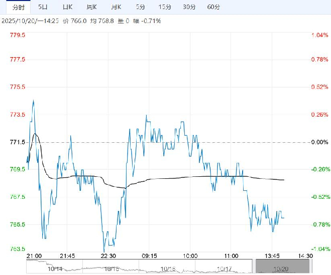 10月20日早盘,铁矿石主力合约弱势下行,目前盘内报766元,跌幅-0.71%。本周铁矿供需结构环比略有转弱,市场关注西芒杜项目进度加快,供应端或有一定增量,情绪上偏空。策略方面:激进投资者可关注轻仓做空思路,关注政策利多带来的加仓机会。