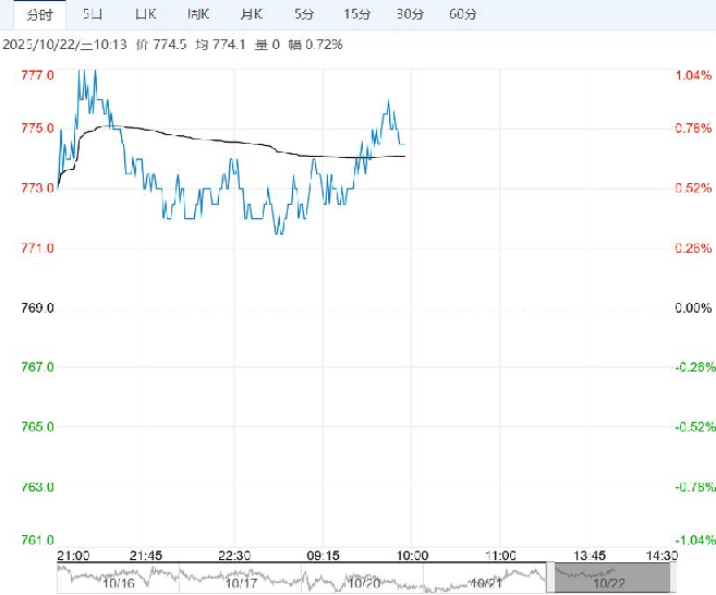 10月22日早盘,铁矿石主力合约震荡走高,目前盘内报774.5元,涨幅0.72%。本周铁矿供需结构环比略有转好,市场关注西芒杜项目进度加快,供应端或有一定增量,情绪上偏空。策略方面:激进投资者可关注轻仓做空思路,关注政策利多带来的加仓机会。