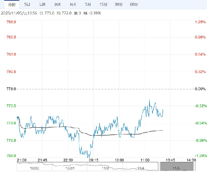 11月5日午盘,铁矿石主力合约弱势下行,目前盘内报775元,跌幅-0.39%。从基本面看,铁水产量延续下滑趋势,铁矿石需求端继续走弱,同时库存压力不减。宏观方面,中美元首会谈以及美联储议息会议均已落地。整体看,宏观兑现后铁矿石基本面现实偏弱,继续提示矿价阶段性回落风险。