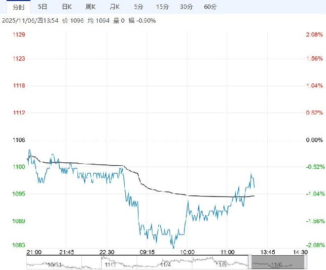 11月6日午盘,玻璃主力合约弱势下行,目前盘内报1096元,跌幅-0.90%。当前下游加工厂采购积极性不足,高库存压力下部分企业的提价意愿不强,制约了价格上行空间。短期来看,宏观政策与减产事件的影响仍将持续,但行情的持续性仍需观察现货成交跟进及库存去化情况。