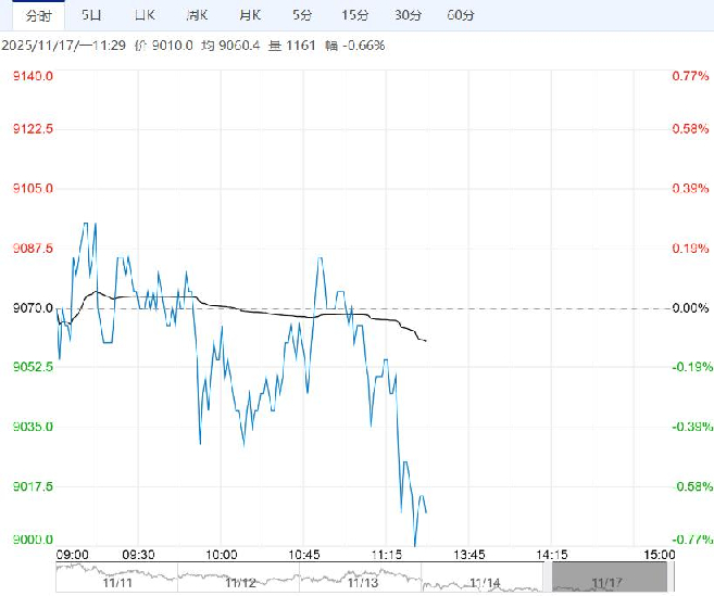 11月17日早盘,工业硅主力合约弱势下行,目前盘内报9010元,跌幅-0.66%。现实头部工业硅大厂逐步复产东部产能,工业硅11月仍有累库预期,供应现实有压力,但因枯水期西南减产带来小幅去库预期,整体近端累库幅度与枯水期去库幅度综合表现为松平衡,供需矛盾不突出。