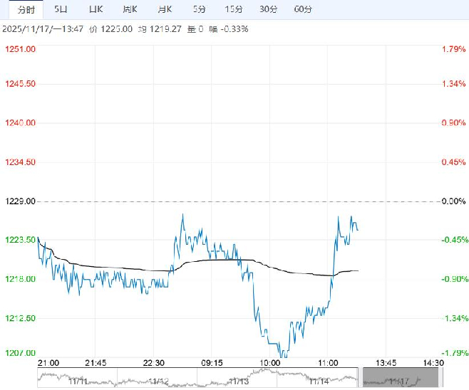 11月17日午盘,纯碱主力合约小幅走低,目前盘内报1225元,跌幅-0.33%。近期基于原燃料价格上行,企业生产成本抬升,华北、华东部分碱厂调涨价格,轻碱相对活跃。部分企业有相应减产降负动作。相关驱动方向向上,但涉及产能减量有限,重点关注龙头企业供应稳定性及新装置投产时间节点。当前成本端存在一定托底预期,但供需矛盾暂难扭转。