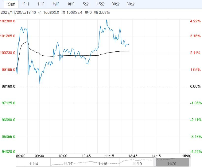 11月20日午盘,碳酸锂主力合约维持高位震荡,目前盘内报100800元,涨幅2.69%。产业链各环节维持高开工,需求强劲无法证伪。价格连续上行或触发潜在扰动,如供给释放及需求增势减缓。当前资金博弈剧烈,注意防范价格大幅波动风险。建议后续关注持仓结构变化、权益市场氛围、锂电材料及电芯排产。