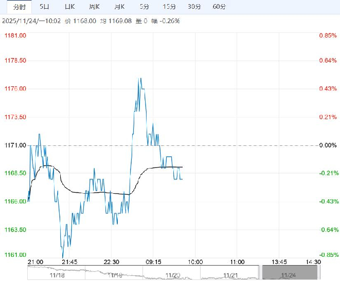 11月24日早盘,纯碱主力合约小幅走低,目前盘内报1168元,跌幅-0.26%。部分碱厂近期调涨价格,轻碱相对活跃,低价重碱相对稳定,个别受低价期现货源冲击出现调降。重点关注龙头企业供应稳定性及新装置投产时间节点。当前成本端存在一定托底预期,但供需矛盾暂难扭转。
