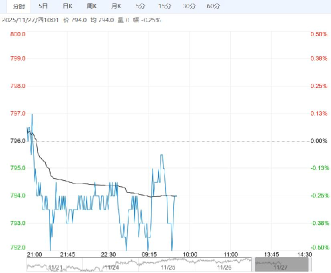 11月27日早盘,铁矿石主力合约小幅走低,目前盘内报794元,跌幅-0.25%。宏观上,美国降息预期重新修复,12月降息预期大增,股市反弹、市场风险偏好修复。操作上,建议保持耐心,当前高基差下做空易面临双重风险,可等待基差修复、盘面反弹后再考虑逢高做空。