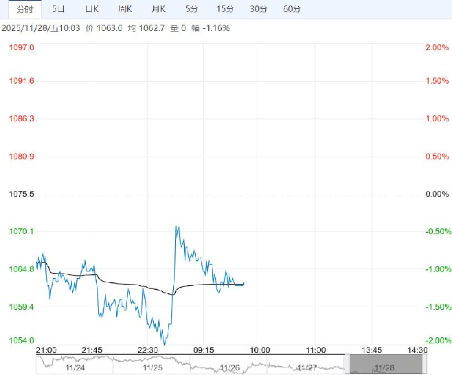 11月28日早盘,焦煤主力合约弱势震荡为主,目前盘内报1063元,跌幅-1.16%。短期政策真空期,盘面受基本面主导,焦煤自身基本面有所转弱,盘面大幅下跌至贴水状态。短期预计盘面震荡运行,等待现货下跌修复基差。后期来看,煤矿供应端制约仍存,铁水高位,钢焦企业经过一段时间的原料消耗后,仍有补库需求。策略上,关注焦煤远月逢低做多机会。