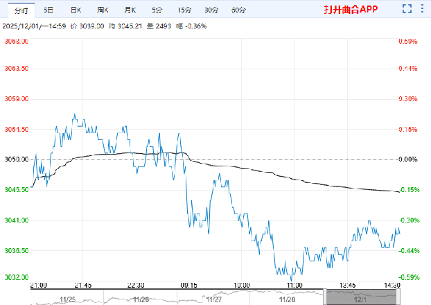 12月1日,豆粕主力合约呈现震荡下行走势,收盘报3039.00元,跌幅0.36%。CBOT大豆价格受需求支撑,豆粕跟随预期上升的成本价格反弹。但豆粕库存依旧处于较高水平,期价宽幅震荡运行,波段操作。