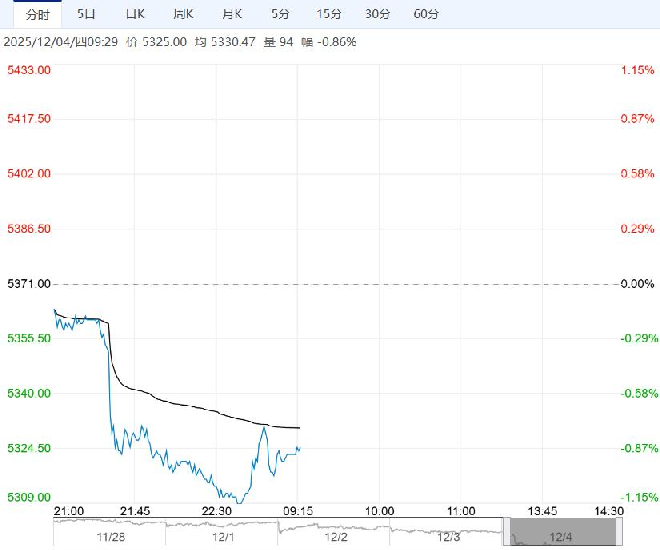 12月4日早盘,白糖主力合约弱势下行,目前盘内报5325元,跌幅-0.86%。国内新作开机陆续增加,季节性压力加大,现货糖价下跌吸引买需,基差大幅走弱,不过郑糖期价已经下探至常规成本附近,限制糖价下跌,但是进口糖成本较低令郑糖跟随原糖波动运行。大供需来看,中国农业农村部11月供需报告上调产量,下调需求,预期期末库存增加,对远期而言承压。
