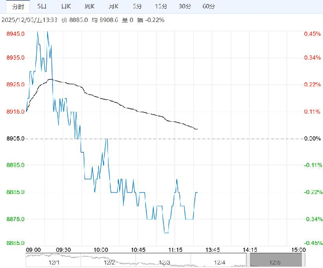 12月5日午盘,工业硅主力合约小幅走低,目前盘内报8885元,跌幅-0.22%。硅铝合金开工率提升,出口端十月净出口大幅减少。下方成本支撑暂稳。整体看工业硅现实状况边际变化有限,供需双弱格局矛盾不突出。盘面价格容易受到新能源其他两个品种资金情绪影响,多为跟随或是补偿性波动。