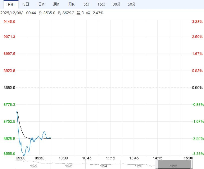 12月8日早盘,工业硅主力合约大幅回落,目前盘内报8635元,跌幅-2.43%。现实供需双弱,有机硅减产叠加出口超预期回落,弱现实矛盾边际走强。因枯水期西南减产带来小幅去库预期,整体近端累库幅度与枯水期去库幅度综合表现为松平衡,供需矛盾不突出。