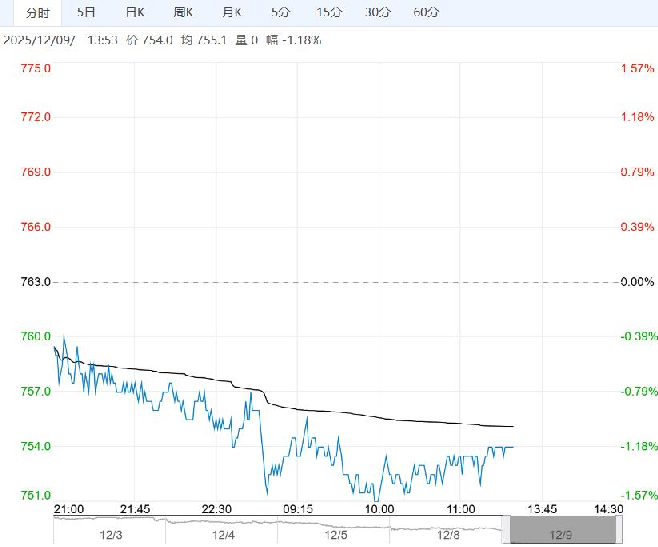 12月9日午盘,铁矿石主力合约弱势震荡为主,目前盘内报754元,跌幅-1.18%。季节性淡季,钢厂持续减产,铁水产量高位回落,铁矿石需求转弱,供应端则处于相对高位,铁矿石供需压力较大。盘面价格贴水现货较大,短线小幅回落。操作建议:短线偏空参与。