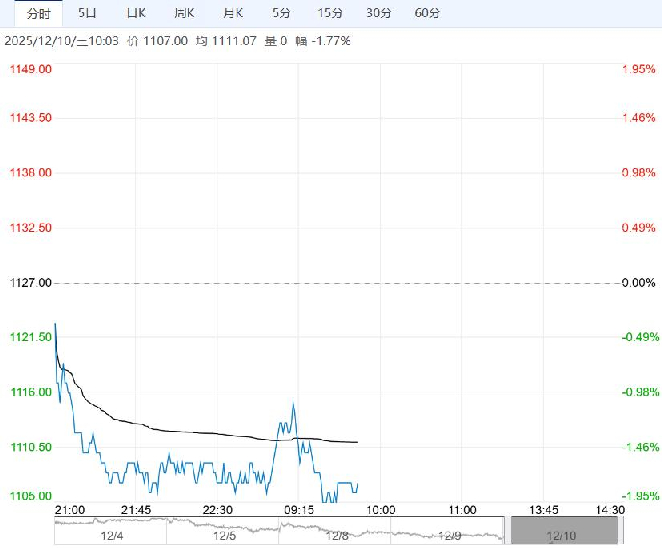 12月10日早盘,纯碱主力合约承压偏弱整理为主,目前盘内报1107元,跌幅-1.77%。需求支撑力度有限,中下游逢低补库,轻碱表现稍好,但大规模储备意向不足,整体刚需跟进为主。整体来看,新增产能投放继续压制纯碱市场心态,期货主力合约持续创新低,短期暂无转势迹象,关注主力合约移仓换月情况、宏观及商品市场整体情绪变化。