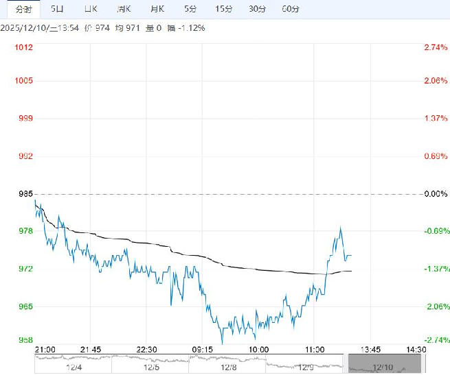 12月10日早盘,玻璃主力合约弱势震荡为主,目前盘内报974元,跌幅-1.12%。需求端跟进情绪继续回落,主流地区产销率昨日回落至80%~90%,仅个别地区维持 平衡产销。多数玻璃厂库存仍有一定压力,降价去库意愿浓厚。期货盘面价格接近前期低点,短期暂无转势头迹象,关注主力合约年内低点支撑位、宏观及政策变化、玻璃产线变化、现货成交持续情况。