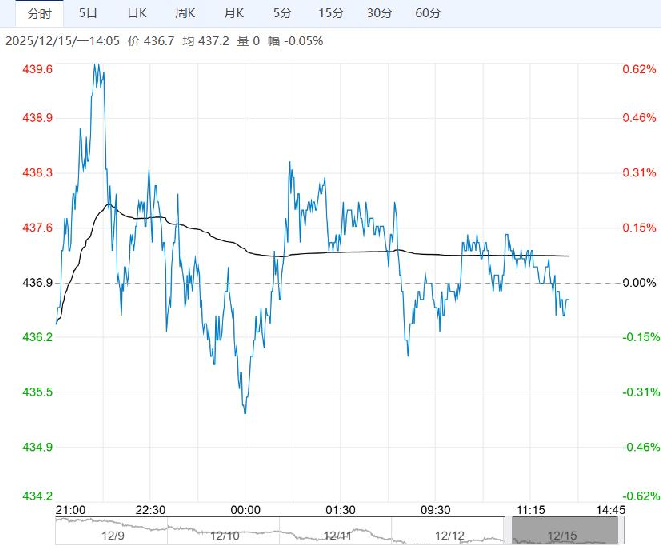 12月15日早盘,原油主力合约小幅走低,目前盘内报436.7元,跌幅-0.05%。原油去库但成品油大幅累库,基本面依旧承压,地缘和宏观仍存反复,谨慎追单,油价震荡承压运行。中期仍以过剩矛盾为主,油价重心仍有下降可能,但需警惕12—1月油价向上修复的风险,该时期有可能出现地缘风险+寒潮冲击+低库存去库所带来的共振。
