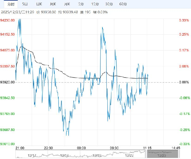 12月23日早盘,沪铜主力合约小幅上涨,目前盘内报93950元,涨幅0.03%。产业上看铜矿供应维持紧张格局,在废铜替代偏少的情况下,供应过剩压力不大,短期价格仍可能冲高。不过2026年铜精矿加工费长单基准稍高于预期,叠加11月精炼铜表观消费稍弱于预期,铜价向上面临的阻力加大。