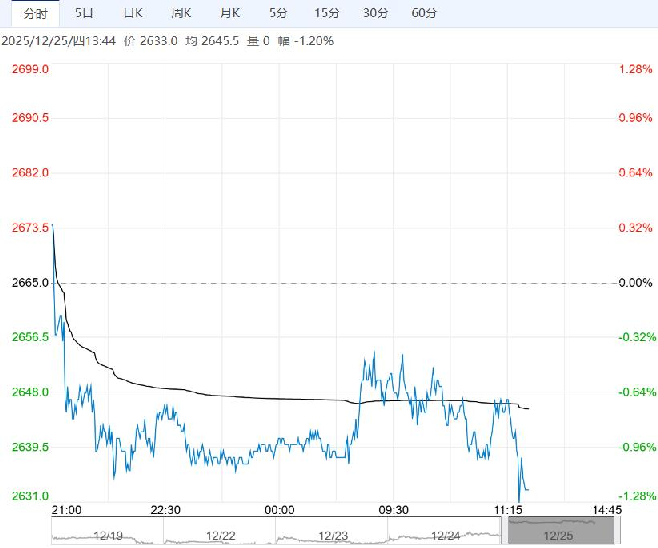 12月25日午盘,氧化铝主力合约弱势震荡为主,目前盘内报2633元,跌幅-1.20%。氧化铝冶炼端产能过剩格局短期难改,累库趋势持续。但当前价格临近多数厂家成本线,后续减产预期加强,且整体有色板块走势较强,追空性价比不高,建议短期观望为主。