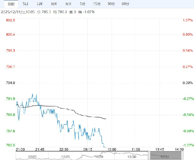 12月31日早盘,铁矿石主力合约弱势震荡为主,目前盘内报785.5元,跌幅-1.07%。近期铁矿供需结构环比宽松,但宏观及产业预期仍然利多,矿价走势偏强。考虑到成材强势难以持续,以及粗钢产量限制对铁矿的压制作用,预计矿价仍有回调空间。策略方面:维持偏空思路,关注反弹加仓机会。