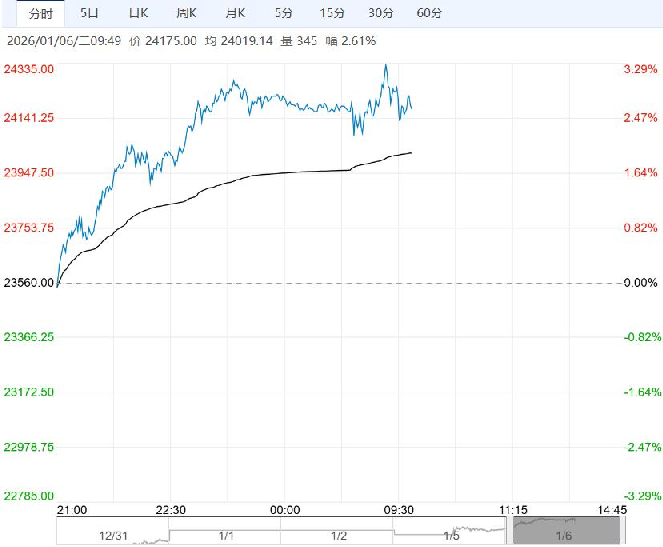 1月6日早盘,沪铝主力合约维持高位震荡,目前盘内报24175元,涨幅2.61%。海外地缘因素扰动下贵金属和铜价预计维持高位,对铝价仍有带动作用。产业上看尽管铝价走高抑制下游开工,但海外铝库存维持相对低位和供应端扰动消息支撑下,铝价有望继续震荡偏强。