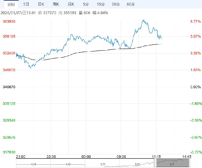 1月7日午盘,沪锡主力合约反弹冲高,目前盘内报357370元,涨幅4.84%。产业面,刚果(金)安全形势恶化,再次引发市场对于锡矿供应担忧,叠加半导体题材热度偏高强化锡市长期需求预期,当前投机资金大量流入有色金属助推行情,谨慎偏多。