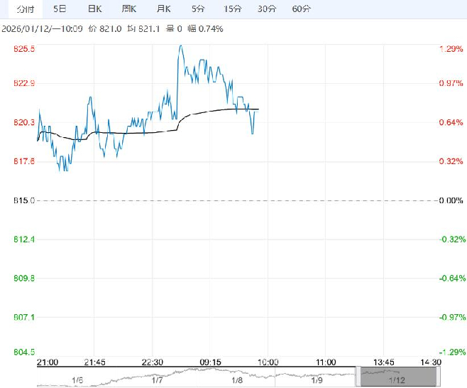 1月12日早盘,铁矿石主力合约震荡走高,目前盘内报821元,涨幅0.74%。市场氛围带动近期黑色系商品补涨上行,矿价上方空间面临高库存与供给宽松预期压制,下方有补库预期支撑,预计短期偏高位震荡运行为主,后续主要关注钢厂补库及铁水生产节奏。市场情绪演绎进入不稳定阶段,波动风险增加,操作谨慎,注意仓位控制。