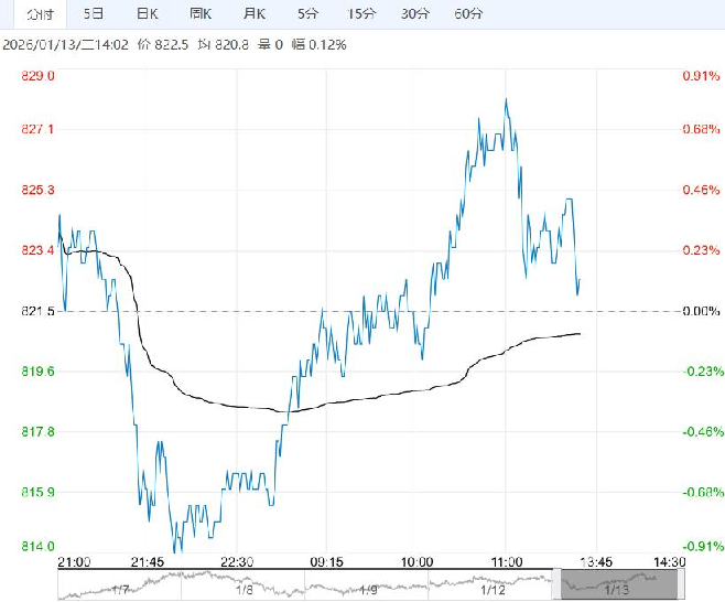 1月13日午盘,铁矿石主力合约小幅上涨,目前盘内报822.5元,涨幅0.12%。近期铁矿供需结构环比转好,叠加宏观及产业预期利多,矿价走势偏强。考虑到成材强势难以持续,以及粗钢产量限制对铁矿的压制作用,预计矿价仍有回调空间。策略方面:短期观望为主,中线维持偏空思路,关注反弹加仓机会。