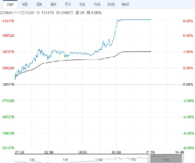 1月14日早盘,沪锡主力合约维持高位震荡,目前盘内报413170元,涨幅8.00%。在炼厂提产不足,下游逢低补库的支撑下,周度去库明显。资金涌入,推升锡价不断刷新高位。不过短期锡价涨幅较大,资金已较为拥挤,期价高位调整风险凸显,追涨需谨慎,后续持续关注刚果金地缘、印尼政策及持仓变化。