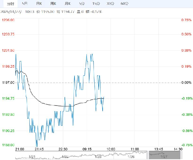 1月27日早盘,纯碱主力合约小幅走低,目前盘内报1195元,跌幅-0.17%。短期纯碱基本面驱动有限,市场受商品情绪影响,暂时观望或以反套尝试。在供大于求格局未有明显改善下,等待市场情绪转弱,仍以逢反弹偏空思路对待。