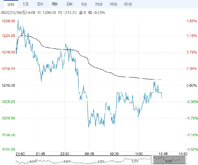 1月30日早盘,纯碱主力合约小幅走低,目前盘内报1206元,跌幅-0.33%。趋势看供应端暂无明确退出路径。部分企业前期承接期现订单,后续出货压力得到缓解。终端据备货情况灵活补库。重点关注龙头企业供应稳定性及新产能达产进度。关注市场对成本端支撑预期变化,供需矛盾暂难扭转。