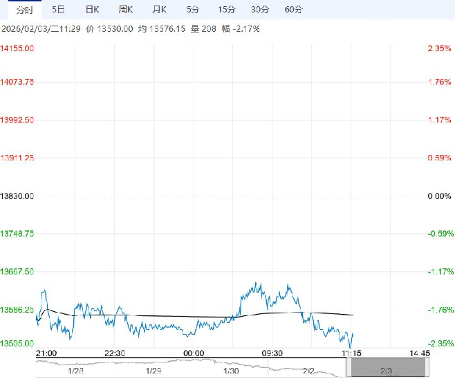 2月3日早盘,不锈钢主力合约承压向下调整,目前盘内报13530元,跌幅-2.17%。基本面方面,国内不锈钢库存连续两周累库,供应宽松而下游节前备货意愿不足,高库存压制价格。现货市场成交疲软,贸易商让利出货,期现联动走弱。