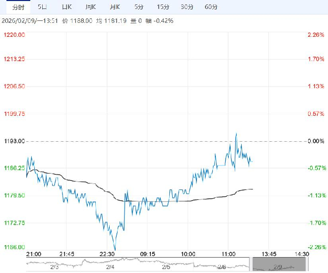 2月9日午盘,纯碱主力合约弱势下行,目前盘内报1188元,跌幅-0.42%。趋势看供应端暂无明确退出路径。部分企业前期承接期现订单,后续出货压力得到缓解。终端节前补库临近尾声。重点关注龙头企业供应稳定性及新产能达产进度。关注市场对成本端支撑预期变化,供需矛盾暂难扭转。